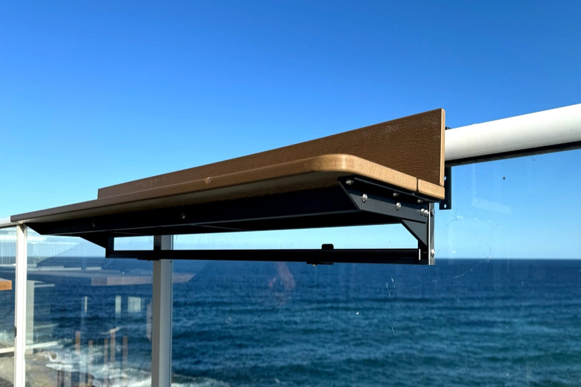 A fold-down balcony table designed for remote work, shared meals and weekend downtime. 80cm wide, easy to install and built to handle the outdoors — no tools or tradies needed.